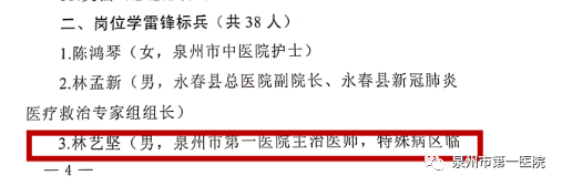 近日,为了大力弘扬勇于担当、忠诚履职、勇于奉献的抗疫精神,中共泉州市委宣传部公布了2020年度全市学雷锋活动示范点和岗位学雷锋标兵的名单,其中泉州市第一医院城东院区重症医学科荣获学雷锋活动示范点称号,泉州市第一医院疫情防控救治区临时党支部书记林艺坚荣获岗位学雷锋标兵的称号。