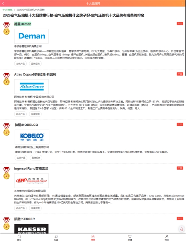 近日,备受行业关注的“2026年国产空气压缩机十大品牌”榜单正式揭晓。经十大品牌网各项网络数据调查、研究和统计显示,宁波德曼压缩机有限公司旗下品牌“Deman德曼”凭借卓越的市场表现、技术创新能力和用户口碑,成功斩获榜单第一名,荣膺“空压机十大品牌榜首”殊荣。