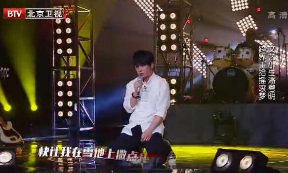 其后上场的是潘粤明,你能想到潘粤明是玩摇滚的吗?小时候听摇滚,玩摇滚,去看摇滚演唱会,他这次选择了崔健的《快让我在这雪地上撒点野》,平时温文尔雅话不多的潘粤明完全展现了他不为人知的另一面。