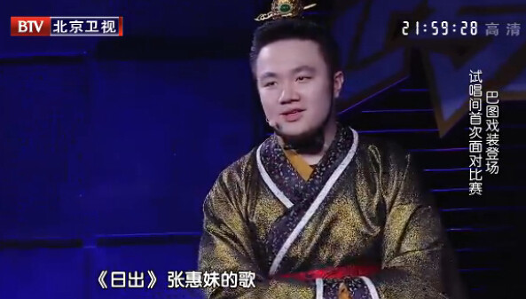 第三个出场的是本次比赛年龄最小的巴图,亲妈宋丹丹对巴图寄予厚望,而有趣的是本场比赛他还遇到了《芈月传》里自己的“母后”刘涛。瘦身成功的巴图身着《芈月传》里的戏服登场,演唱了张惠妹1999年的老歌《日出》,但很遗憾,试唱间里巴图即惨遭淘汰,并未正式登台。