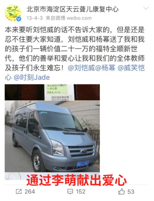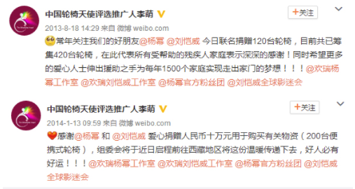 并且, 杨幂工作室也发出了之前通过“萌萌”献爱心的证据,可以看到,2013年的时候,微博上一位名叫“中国轮椅天使评选推广人李萌”一直跟杨幂和刘恺威有着互动,通过他们的名字在微博宣布献爱心,目前,这位李萌已经无法联系。
