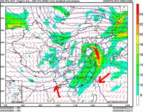 朋友们,看看图里的588线(就是大红箭头指的那根,588线是常用来观察副高位置强度的等压线),它稳稳盖着华南地区以及云南南部的部分地区。