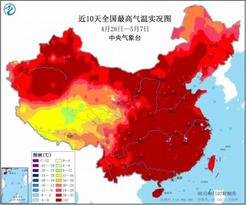 过去两天,在副热带高压的影响下,云南南部、贵州南部、湖南南部、广西大部、海南、广东部分地区出现了35℃以上高温,6日有39站气温达到或突破了5月历史纪录,7日52站气温突破或追平5月纪录,而且其中还有28站达到或超过整个观测史纪录。